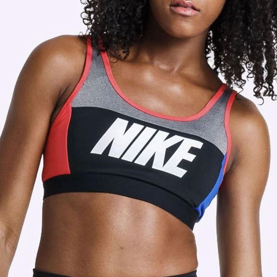 A breathable V-back strap design lets you move freely during high intensity workouts such as spin and running, while "NIKE" graphics on the straps and chest make a bold statement.