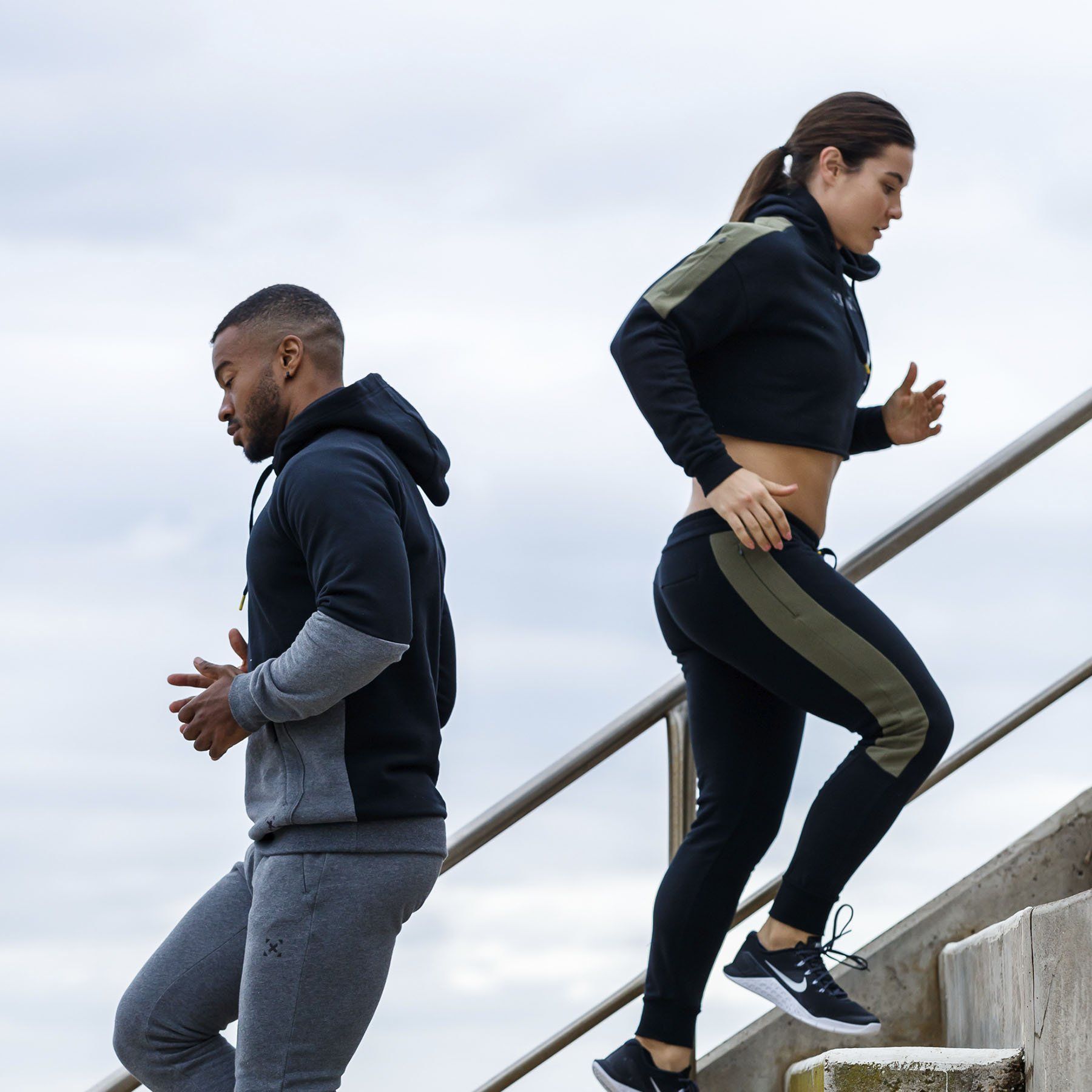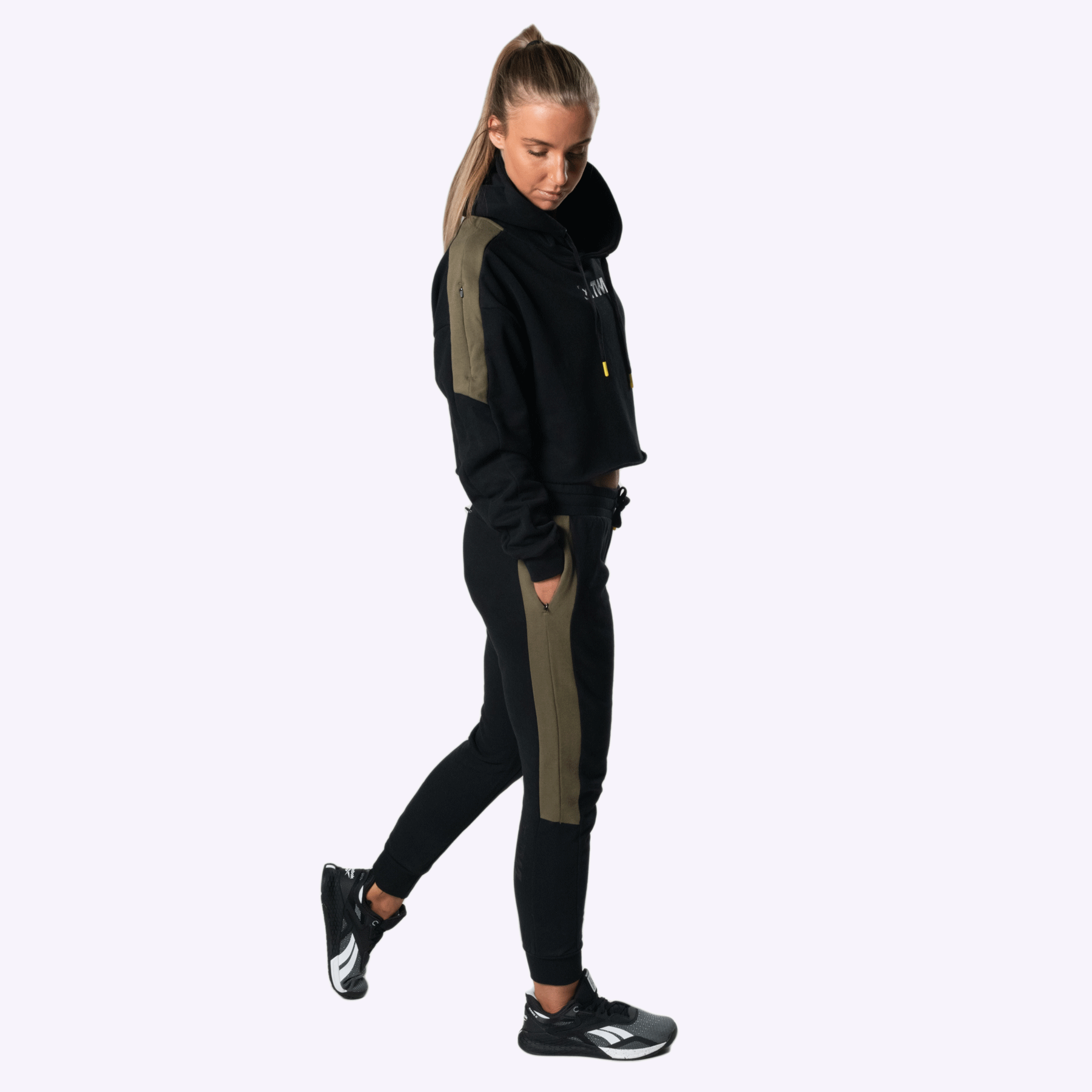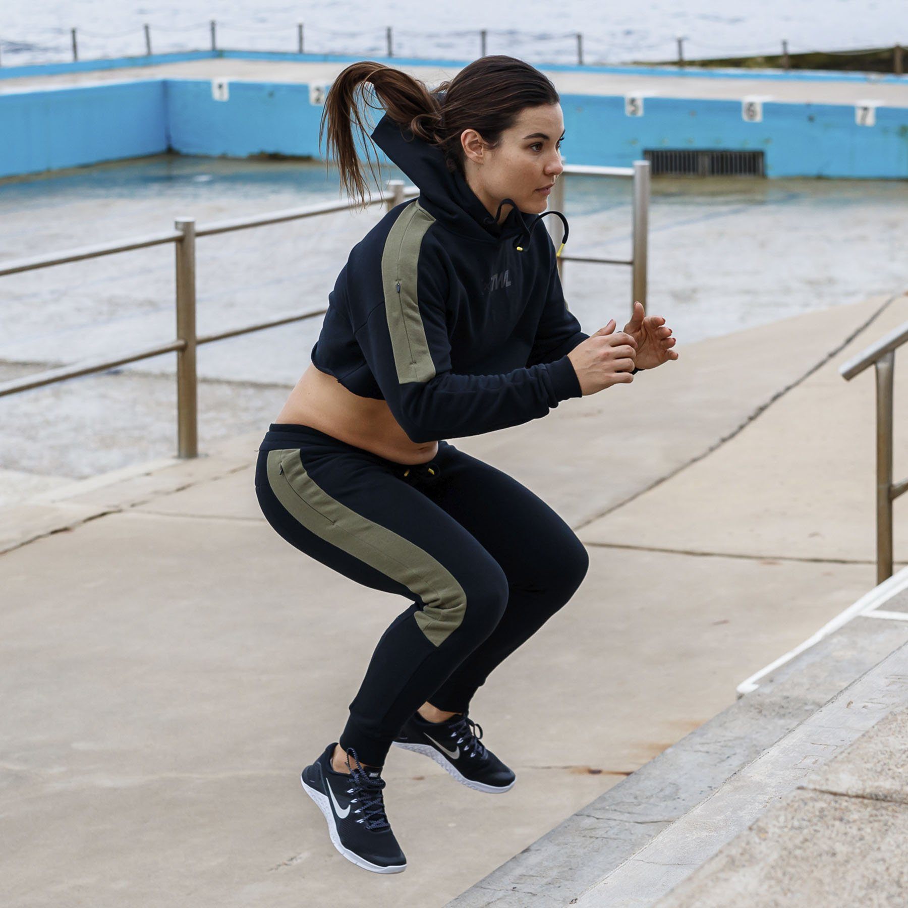 Our model is wearing size small pants and hoodie. She is 164cm (5’5”) tall with a 70cm (27”) waist.